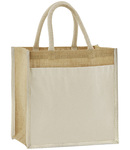 Unlaminated starched jute. Cotton carry handles (40cm long). Cotton canvas front pocket. Cut out label. Capacity 14 litres.